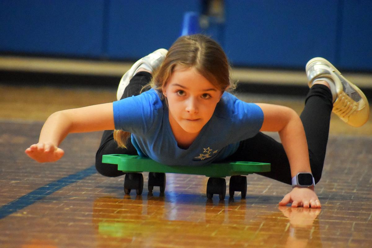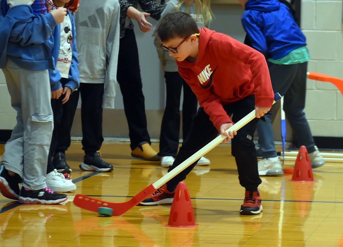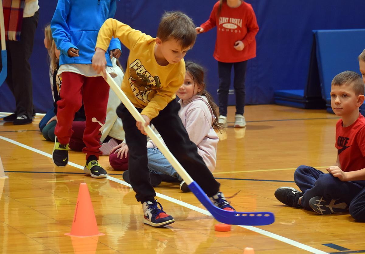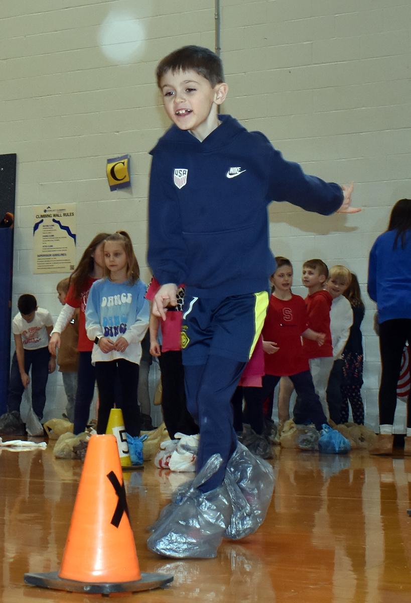 The second-graders joined in versions of various Olympic events such as curling, using dust mops and bean bags, and mogul skiing with hula hoops and pool noodles. Other events included figure skating, hockey, and skeleton.