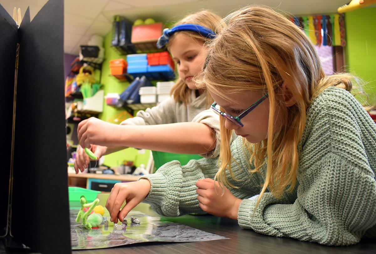 The second-graders are now working to create stop-motion animation videos starring their alien selves, who are exploring one of three assigned settings — Space, the Moon, Mars — each with different plot challenges.